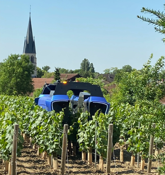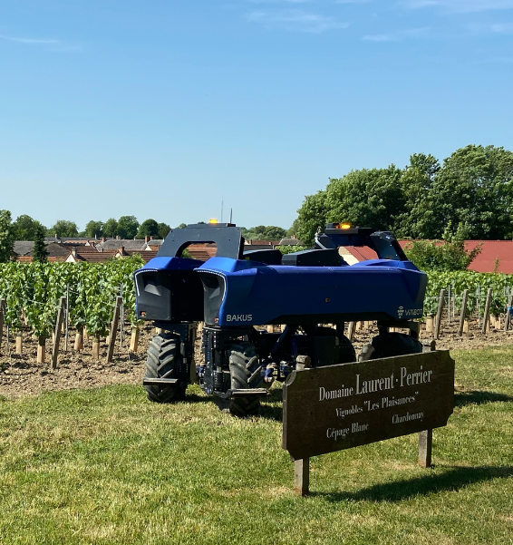 Laurent-Perrier, innovateur en champagne, investit sur le vitibot, un robot enjambeur autonome et électrique, capable de désherber mécaniquement le sol et de tondre l’herbe.