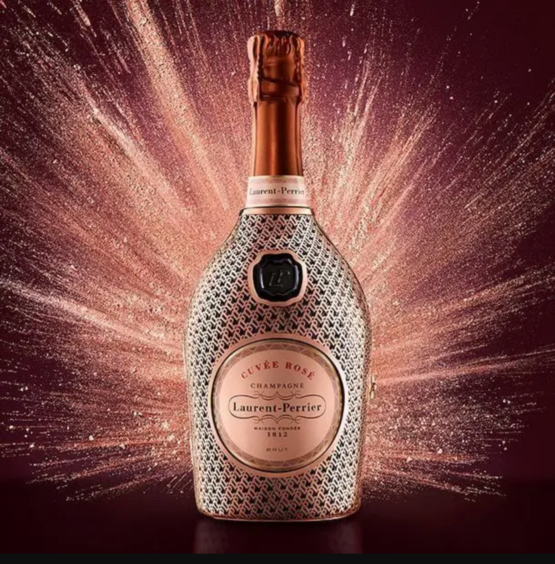 Das rosé-goldene Korsett aus den Laurent-Perrier-Initialen LP korrespondiert wunderbar mit den Rundungen der einzigartig geformten Flasche.